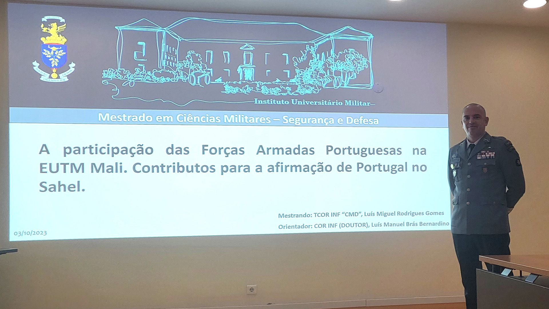 A prova consistiu na discussão pública da dissertação intitulada “A Participação das Forças Armadas Portuguesas na EUTM Mali. Contributos para a Afirmação de Portugal no SAHEL” do candidato Tenente-Coronel Luís Miguel Rodrigues Gomes, do Exército.