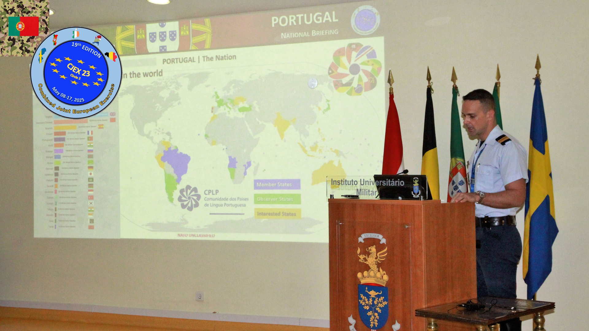 • Lisboa no Instituto Universitário Militar, contado com a participação de quatro tutores, um elemento da organização, um docente militar observador da Escuela Superior de las Fuerzas Armadas (ESFAS) e 47 alunos de 14 diferentes nacionalidades (Alemanha, Bélgica, Brasil, Cabo Verde, Espanha, Gabão, Irlanda, Marrocos, Níger, Países Baixos, Portugal, São Tomé e Príncipe, Suécia e Tunísia);