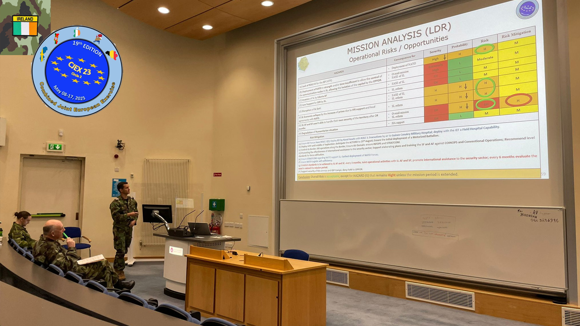 • Galway em instalações da Universidade de Galway à responsabilidade da an Scoil Ceannais agus Foirne/ Command and Staff School (CSS) da an Coláiste Míleata/ Military College (MC), contando com a participação de três tutores, três elementos da organização e 43 alunos de 11 diferentes nações (Bélgica, Benim, Canadá, Congo, Estados Unidos da América, França, Irlanda, Luxemburgo, Países Baixos, Portugal, Suécia).
