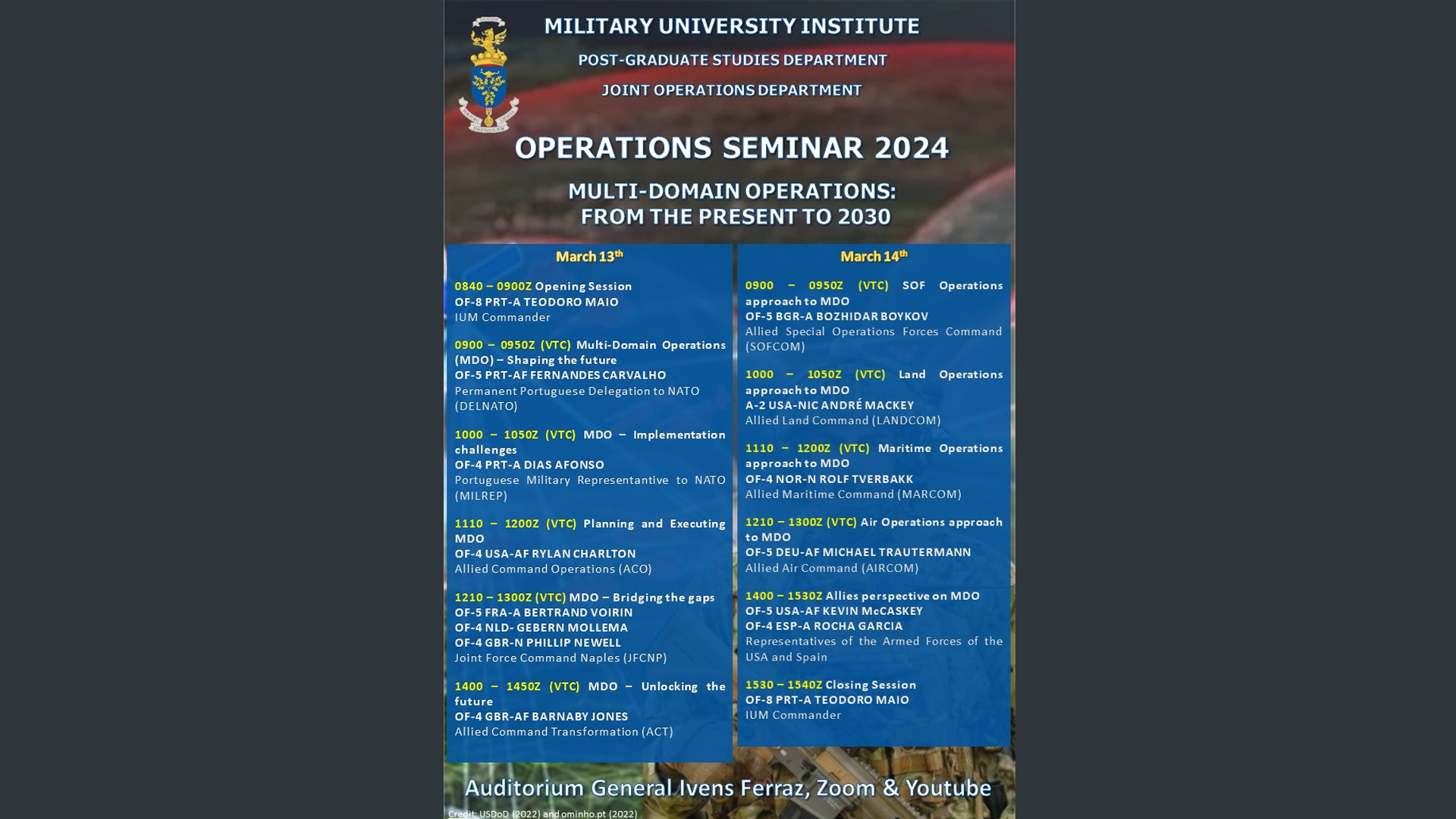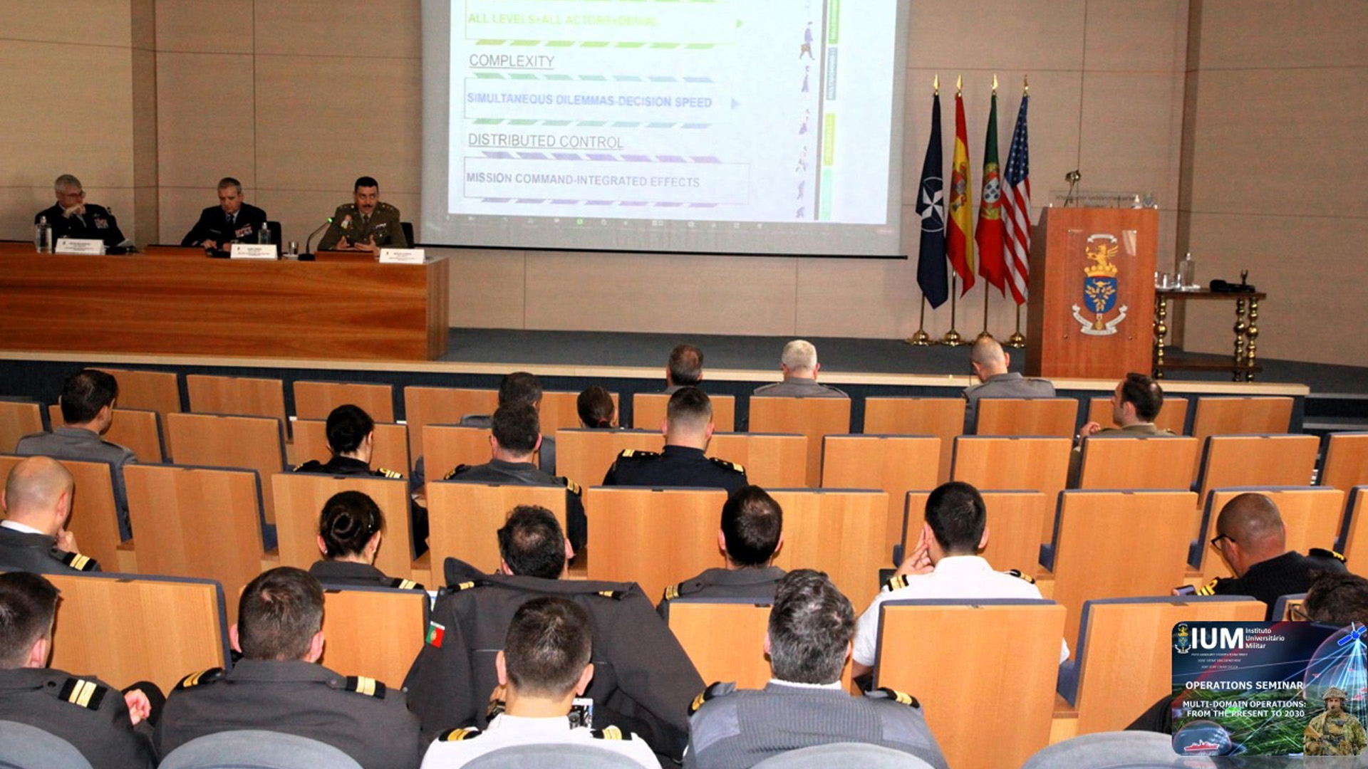 Decorreu nos dias 14 e 15 de março de 2024 o Seminário de Operações, promovido pela Área de Ensino de Operações Militares do Instituto Universitário Militar (IUM). Este foi o segundo de três seminários, na sequência de uma linha de investigação a três anos sobre a temática de Operações Multi-Domínio (OMD).
