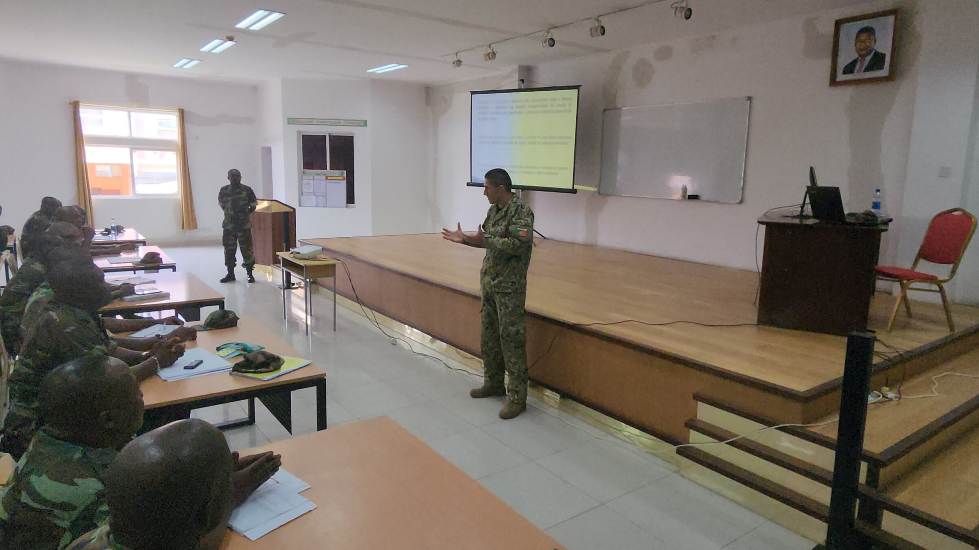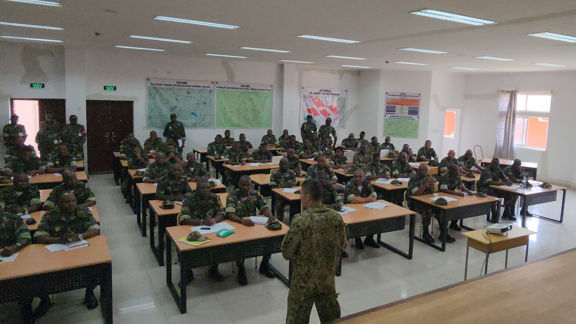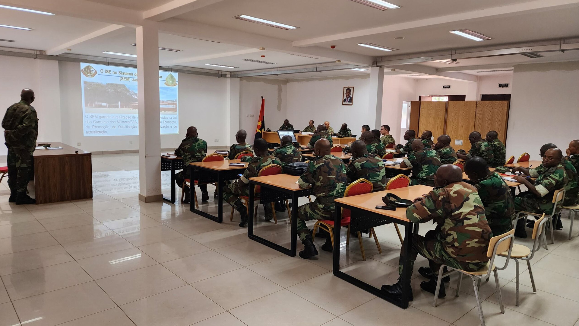 Durante a visita ao ISE, a delegação teve acesso a um briefing institucional detalhado sobre os cursos oferecidos pelo instituto, destacando-se o 1º CCEM-E, com 56 alunos; o 3º Curso de Promoção a Oficial Superior (CPOS), com 218 alunos; e o 2º Curso de Promoção a Capitão (CPC), com 93 alunos. O TCOR Monteiro, destacado como professor do Instituto Universitário Militar e enquadrado pelo P5 em Angola, é o responsável pelas unidades curriculares de Técnicas de Estado-Maior e Operações Ofensivas nos escalões de Brigada e Divisão, no âmbito do CCEM-E.