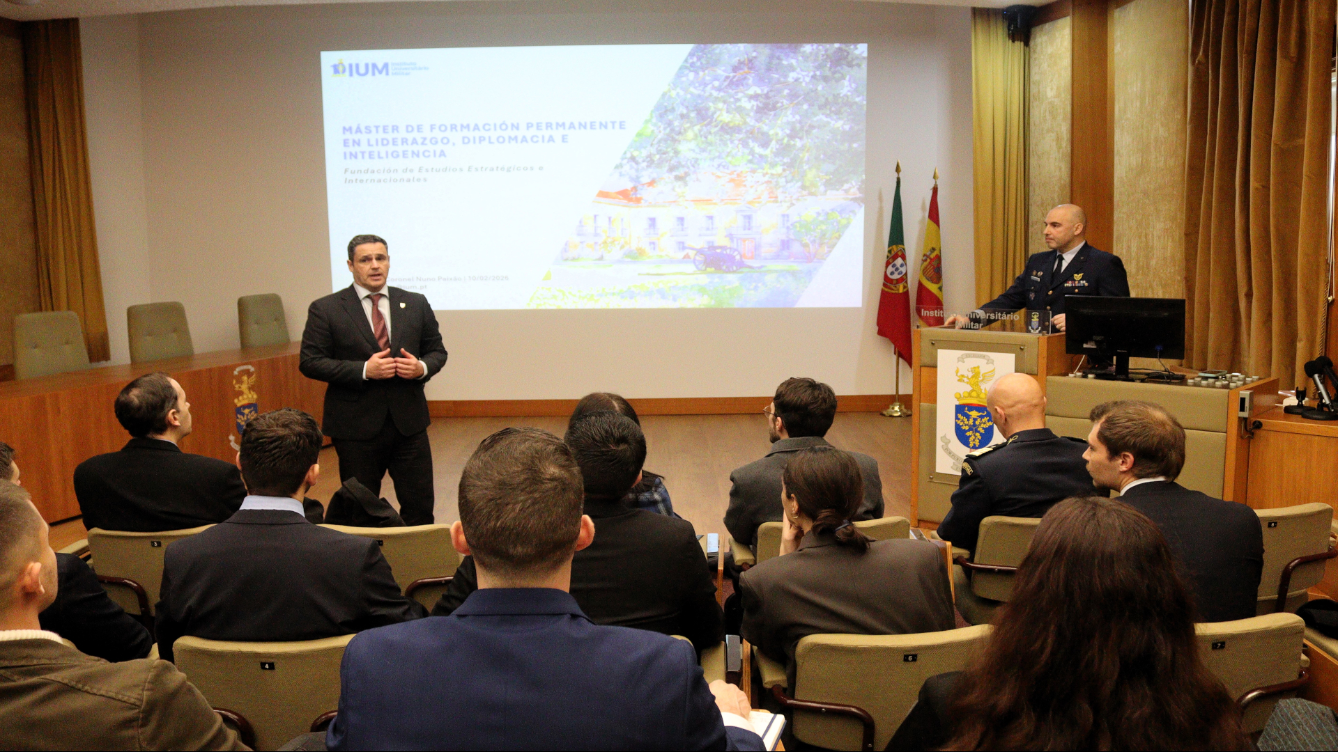 O Instituto Universitário Militar (IUM) recebeu, no dia 10 de fevereiro, os auditores do curso “Máster de Formación Permanente en Liderazgo, Diplomacia e Inteligencia”, no âmbito da parceria estabelecida entre o Instituto Superior de Ciências Sociais e Políticas (ISCSP) e a Fundación de Estudios Estratégicos e Internacionales.